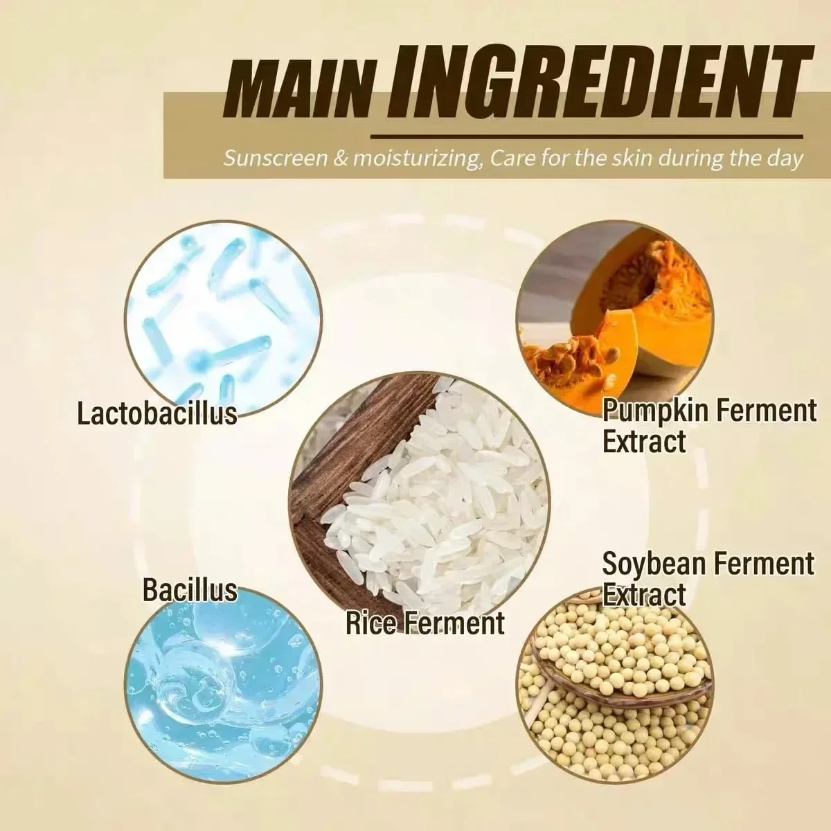 Experience next-level skincare with this lightweight, multitasking cream. It combines Korean rice-derived brightening actives, soothing probiotics, and broad-spectrum SPF50+ protection — delivering hydration, radiance, and defense in one luxe formula.